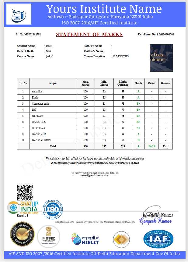 🔹 RESULT, MARKSHEET & CERTIFICATE